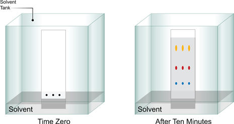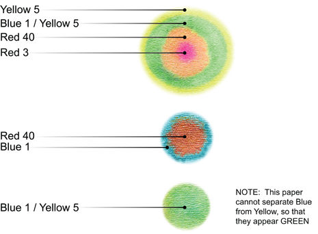 當和薄層色譜板比較的時候,請注意這種特殊紙張分離能力的區別。綠色圓環表示這張紙無法分離黃色和藍色染料,但它可以將紅色染料分離開來。下圖中,由同樣的黃色和藍色染料組成的一個綠色樣品點在紙上。如你能預料的,這張紙無法分離這兩個染料。在圖中,由紅色和藍色組成的紫色樣品被點在紙上,它們被分離得