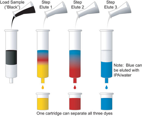 技術3.在這個最有效的方法中,樣品流進一個柱子或填有適當顆粒[固定相]的柱管裝置。這些顆粒稱為色譜填料。溶劑[流動相]流過這個裝置。在固相萃取中[SPE],樣品被裝入柱管里,溶劑攜帶樣品流出這個裝置。正如在茨維特的試驗中,樣品中化合物由于在管路中的流動速度不同而得以分開。黑色樣品被放入柱管里。每一步使用不同溶劑得到分離。